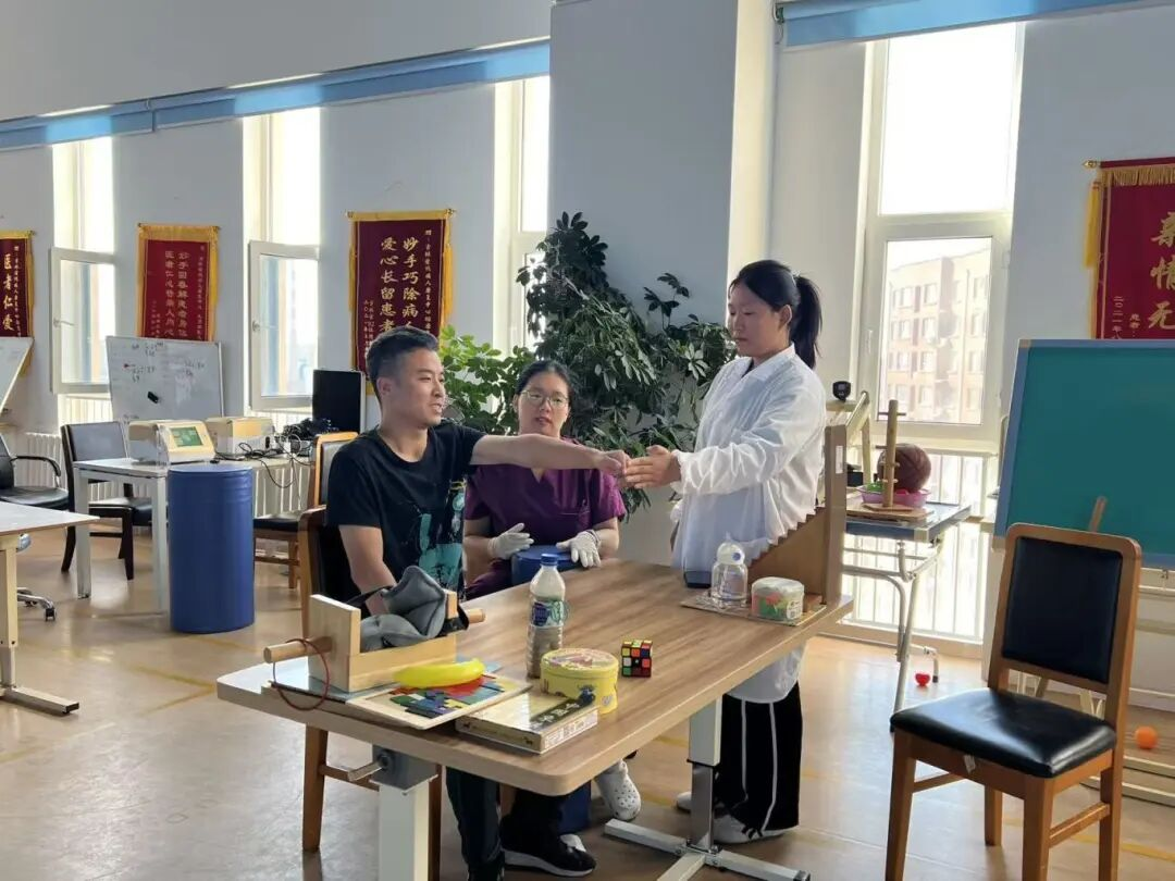 At 14:00 on September 18,Dean Zhang Xu's team arrived at the Jilin Provincial Rehabilitation Center for Persons with Disabilities.During the symposium,the hospital introduced the overall situation of JCVC's interns and recognized the performance of the rehabilitation therapy technology interns.Based on the hospital's feedback,both parties exchanged views on issues encountered during practical training.Subsequently,Director Liu and Teacher Dong accompanied the JCVC delegation to various departments to observe students'on-duty internship situations.Dean Zhang Xu advised students on site:"Turn standardization into muscle memory,shoulder responsibility as a professional belief,and cherish every hands-on opportunity."